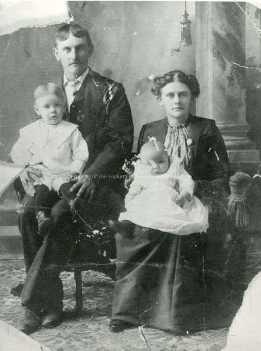 A black and white copy of an portrait of an unidentified man & woman, with small boy and baby girl. Man is sitting holding small boy and lady is holding small baby.