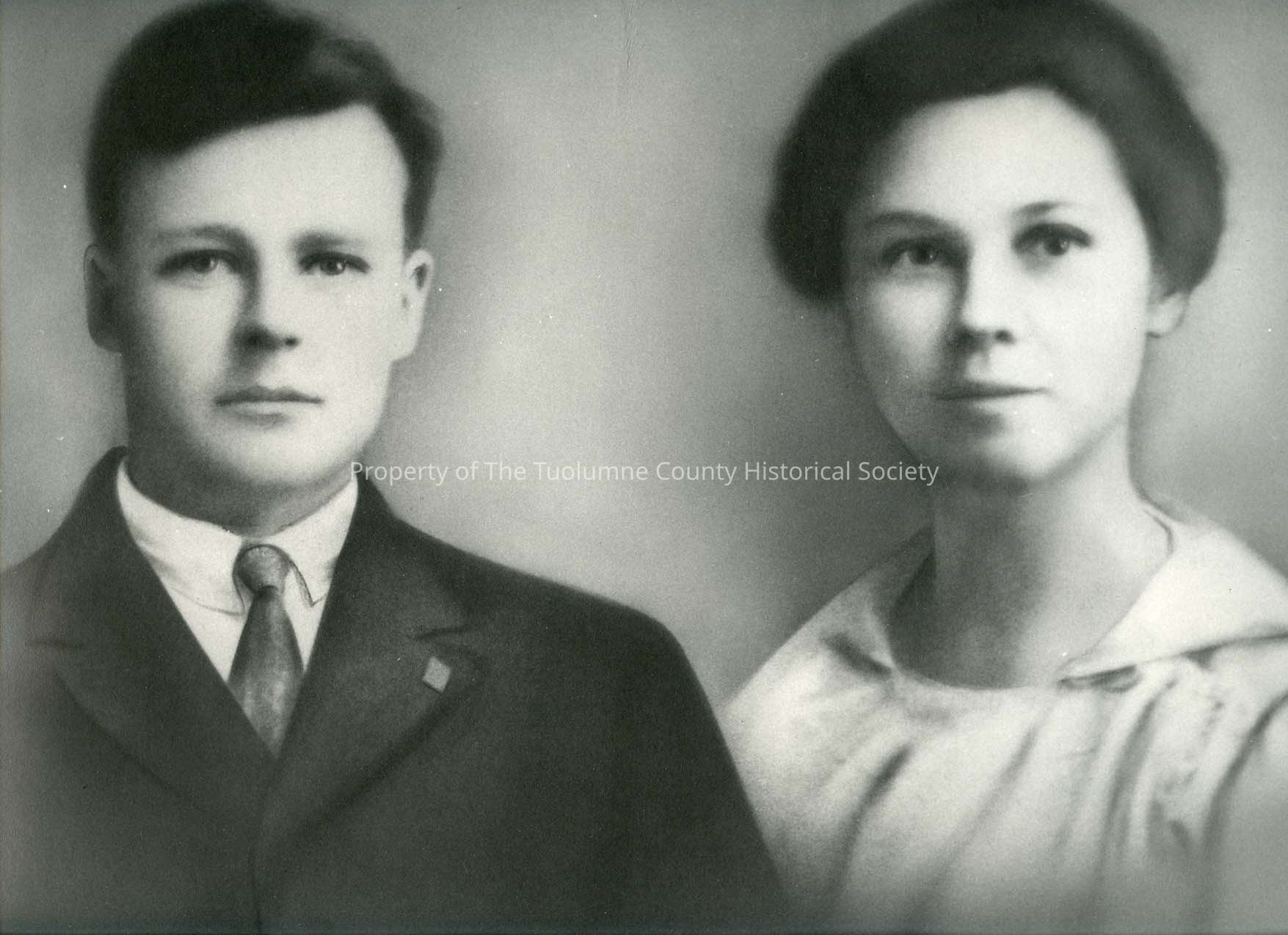 Portrait-Man and Woman Unidentified. "Sherry" written on back. Copy of a photo. He is wearing a jacket, shirt and tie. There is a pin in his lapel. She is wearing a light colored dress with a wide collar. Her hair is pulled back.