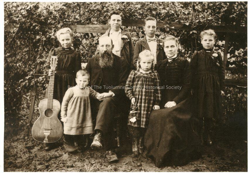 An 8" x 10" sheet withe two (2) 4-3/4" x 6-3/4" photos of an unidentified family of two (2) adults and six (6) children. One young girl is holding a guitar. Man has long full beard.