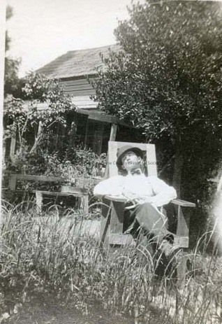 Portrait-same man unidentified sitting in same chair as in photo 11,965. House in background.
