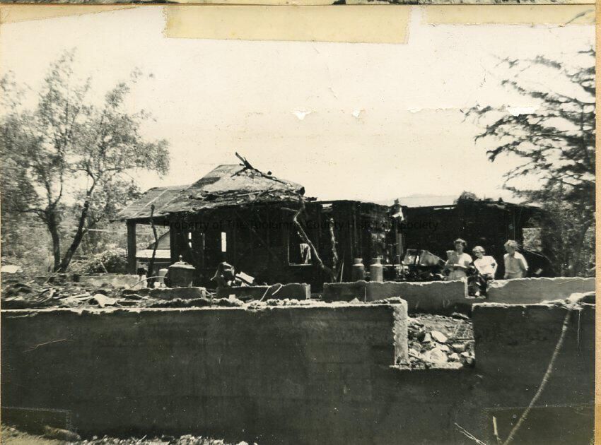 A Black and white photo of the fire damage to the First Presbyterian Parsonage, Columbia 1950. Photo shows the remains of Parsonage. Album #17