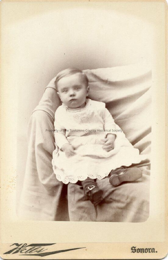 A black and white portrait of a little child. Wearing dress with long sleeves and eyelet around neck, dark shoes with buckle. Sitting in a cloth covered chair. Photo from Album #2Collection