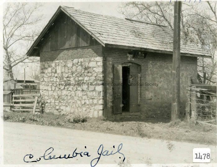 Columbia Jail, 1930, photo by Dr. Hood. Pictured is side front showing the rock construction and the iron door, fenced area behind the building. Other building are in the back ground.