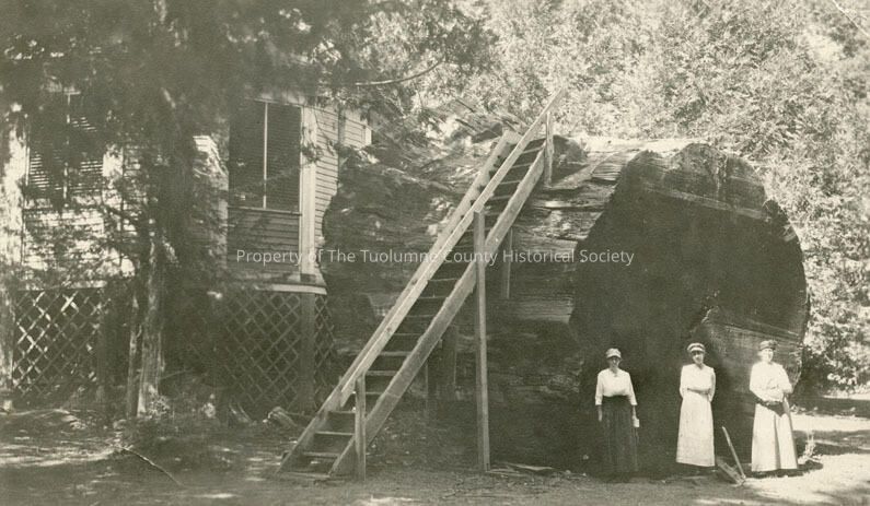 A black and white photo of three unidentified ladies, in front of a huge part of a redwood log. Album #17 Type: Paper
