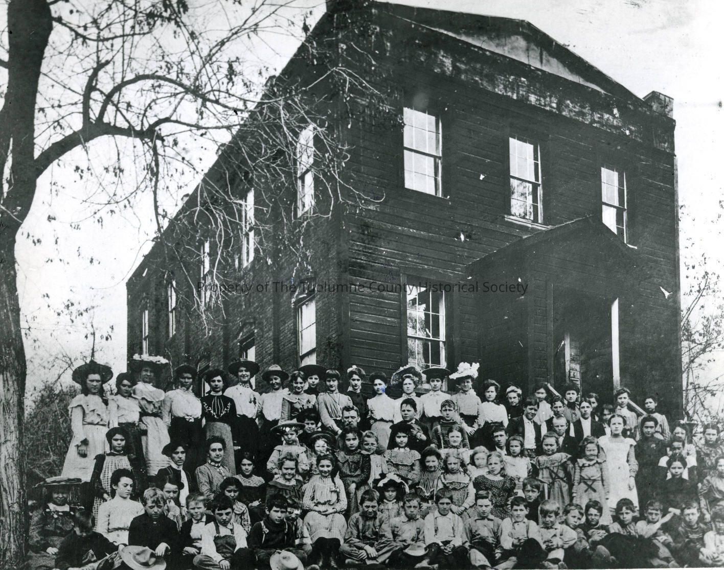 Entire school in Columbia 1903. G.P. Morgan seated in center and teachers, Miss Brady and Miss Siebert are sitting left of center., community schools Columbia Grammar