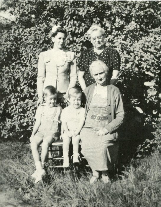 A black and white copy of a photo of an unidentified Family Group, three (3) women and two (2) small boys. Elderly women and the small boys are sitting on bench and the other ladies standing behind.