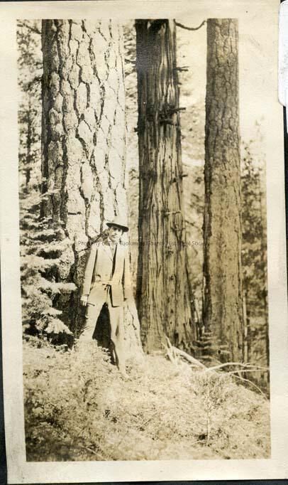 Trees- Timber Claim. Man standing near large tree not identified. Location unidentified. Photo size 4.5" x 2-3/4" black and white. Type: Paper