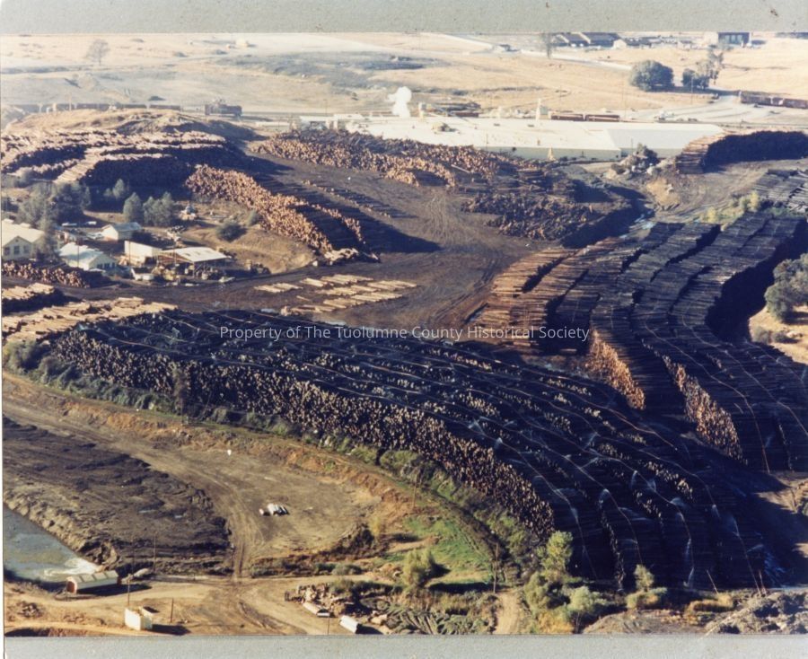 Color photo Arial of Standard Mill log deck, large piles of cut logs, some getting watered, train cars in background, couple of out buildings and large mill. open land in background.