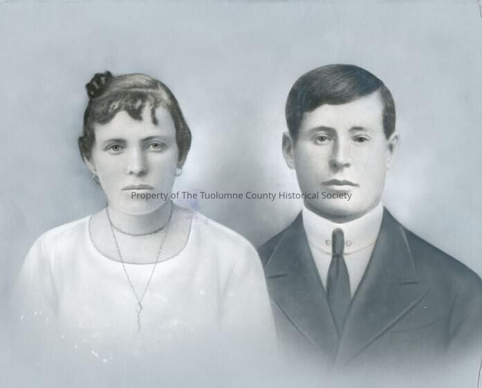 A photo of the an unidentified man and woman (Werth ?). Woman has short hair with bangs, wearing earrings and necklace. Man dressed in suit and tie, dark hair with side part.