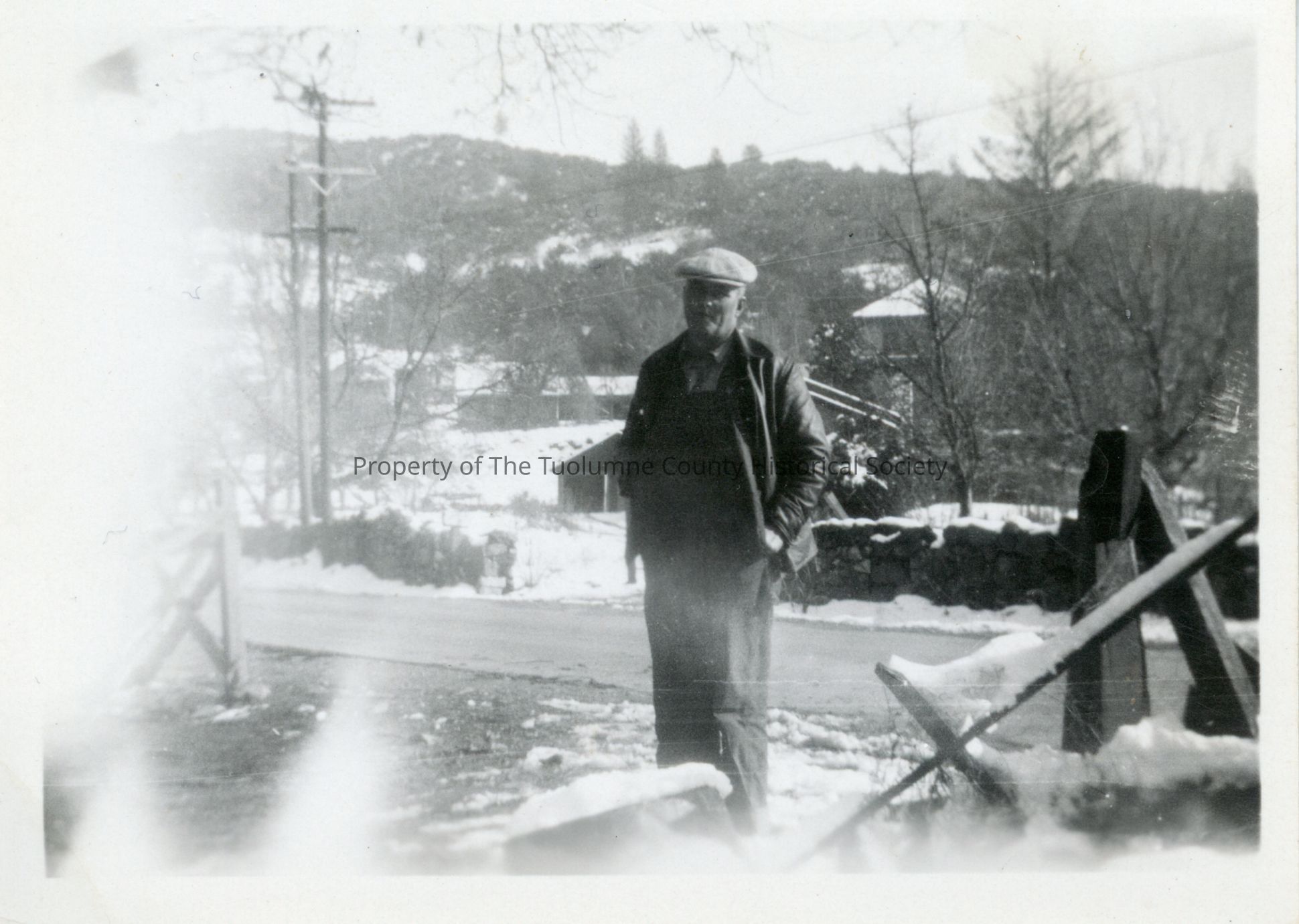 A photograph belonging to the Pedro family collection given to the Grand Lodge F. & A. M. of California, Henry W. Coil Library & Museum of Freemasonry by Leslie Woodworth. Snowy scenes of Browns Flat, California. An unidentified man standing in a bare spot with snow showing around him.Collection