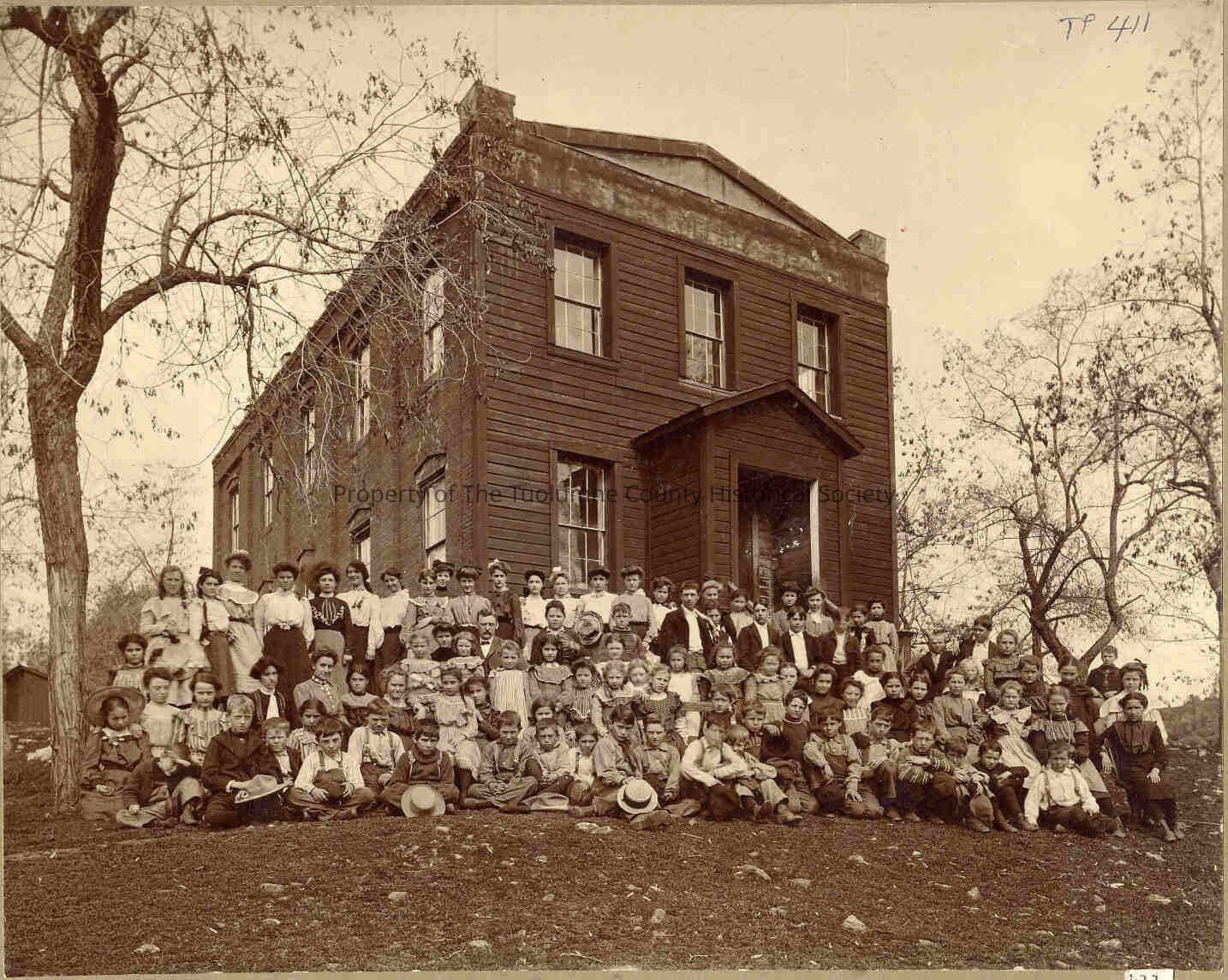 Brother 2nd row left, No. 4 is Miss Mary Brady, teacher of Columbia. George Jackson, Columbia is her son. Next to miss Brady is my aunt Nellie Siebert, (Mrs. James Hilton Toomey). She was youngest daughter of my grandfather, Franz Anton Siebert. G.P. Morgan, in front of 10th Girl in back row, left I think the girl back of dad(?) is Dolly Mapes, ( Mrs. Fred Honey of Soulsbyville). "