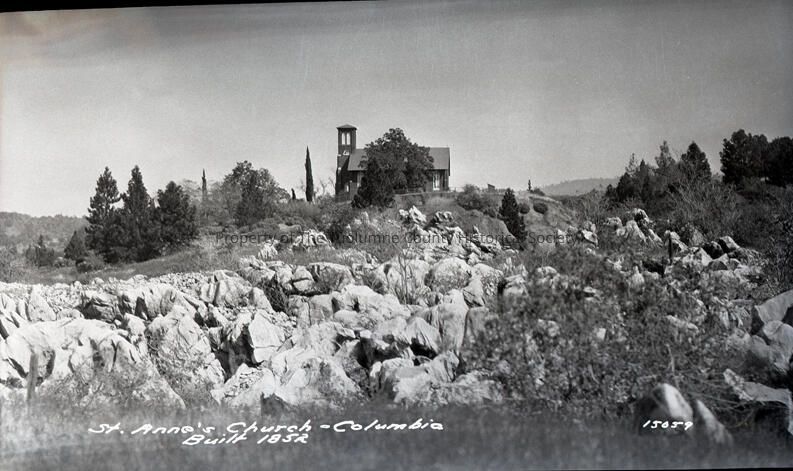 149C "St. Anne's Church, Columbia, showing rocks in foreground. Taken 1927. Good for cards - written on negative "St. Anne's Church-Columbia built in 1852" actually built in 1856.