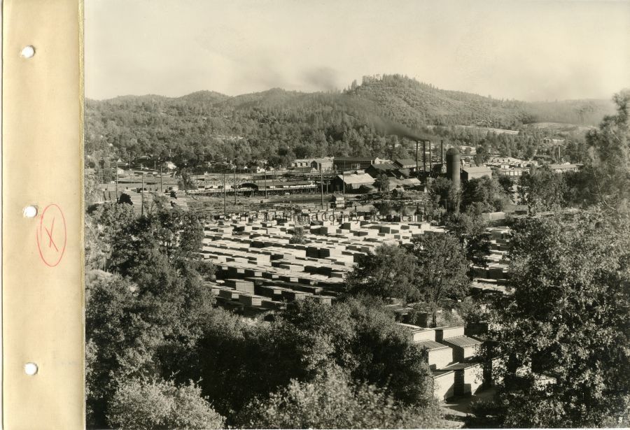 Black and White photo on hill looking over the west side mill and storage. Hill and trees on opposite side of the valley and some town in photo