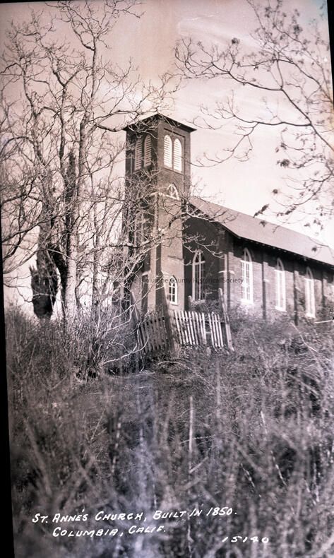 189-C St. Anne's Catholic Church angle view. Showing trees and grave, 1929. Good for cards. Leonard Ruoff - They had hydraulic mined out the area up to the graves.Collection
