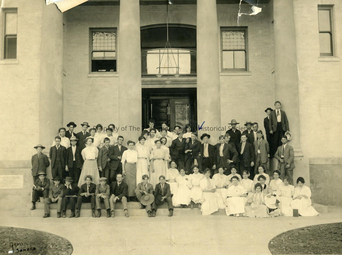 Tuolumne County High School. Front of the first building, later known as the administration building. Horace E. Sandoval is identified by arrow in the center of the picture. Photo is of the entire student body. 1907.