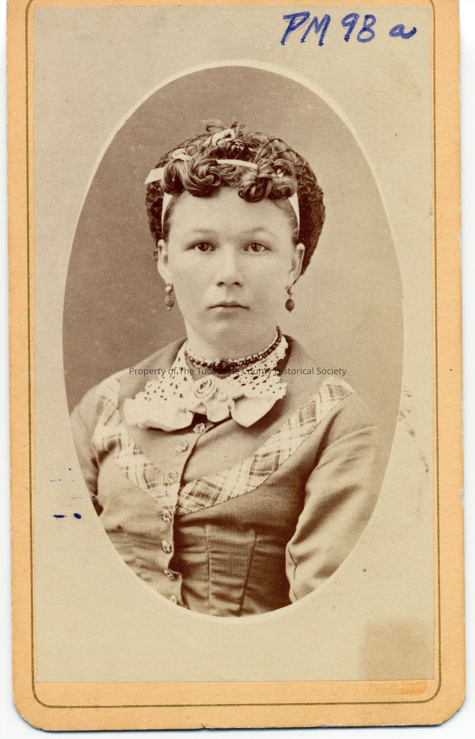 Portrait of unknown young woman in light colored dress with buttons up the front and plaid trim. She is wearing lace and fabric rose around the neck, choker jeweled necklace, and drop earrings. Her hair is in very tight braid/curls with a ribbon in her hair.Collection