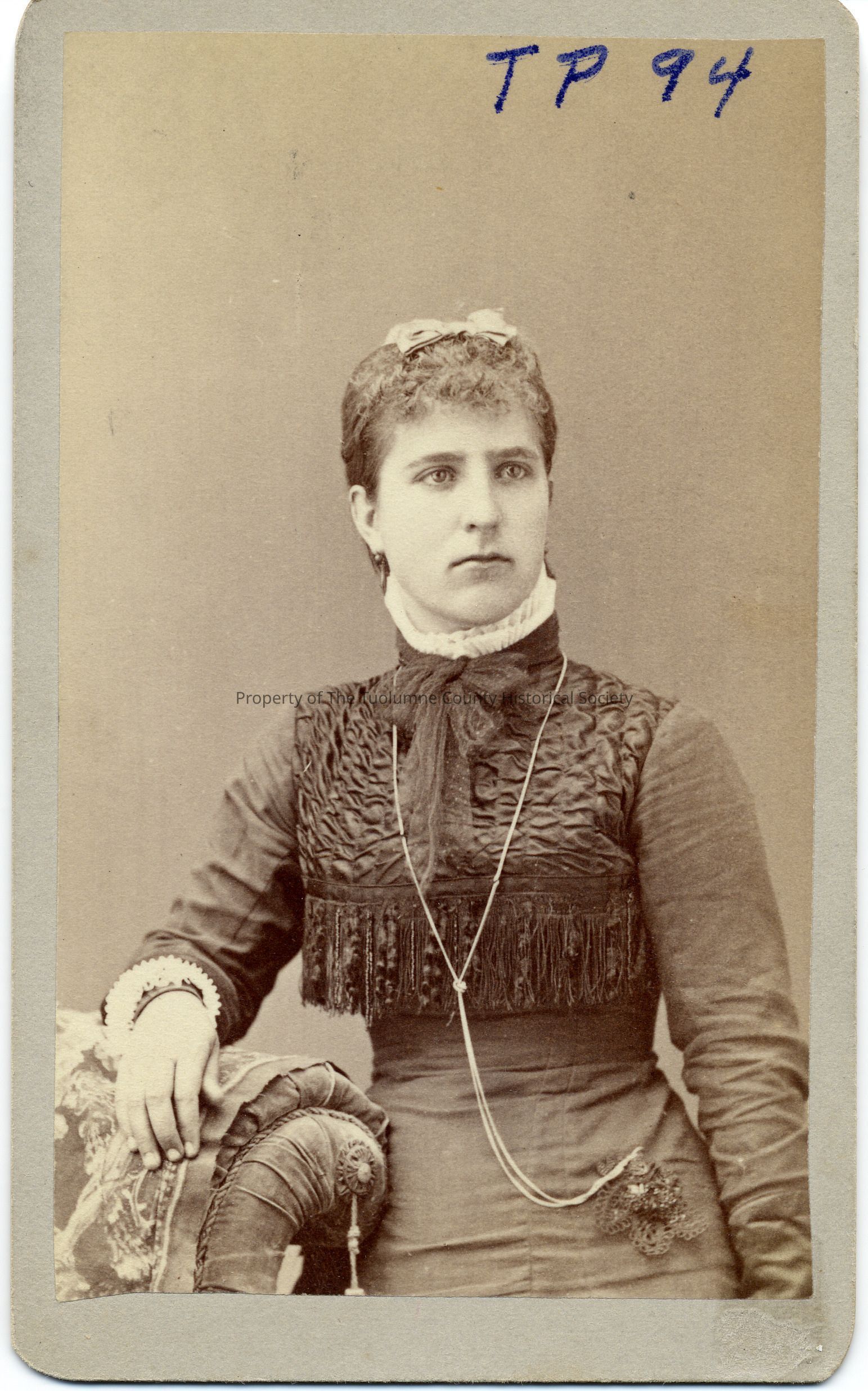 Portrait of unknown young woman wearing dark dress with white lace cuffs and collar, dark bow at the neck, ruffled bodice with fringe, long chain which is clasped at hip. Right arm is resting on back of chair.Collection