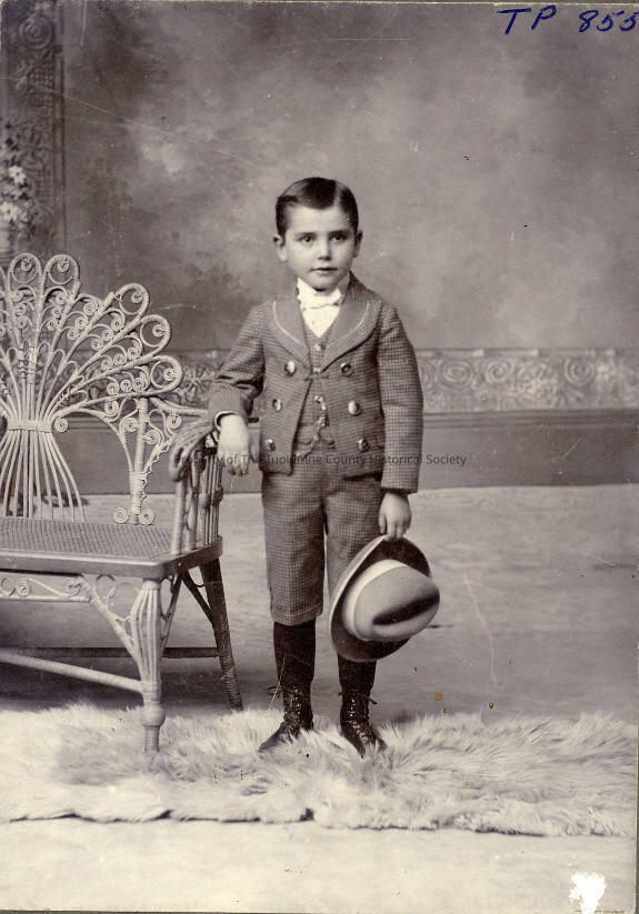 Young boy, Dressed in a suit with a vest with a watch bob, short pants, boots, knee socks and White bow tie holding a matching hat. Standing in the studio on a fuzzy rug with his arm on the edge of a antique bench.
