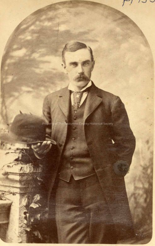 People, Unidentifed man, Studio portrait, Men's fashions, Men's hairstyles, Moustache, Men's hat, Wells Studio, Sonora, Unidentified Man, 3/4 length portrait, shown in studio setting next to ivy covered column, right side leaning on column with hat in hand, hat is short brimmed, round crown, he is wearing a dark frock coat, plain vest, split collar with striped wide tie, jewelled stick pin in knot. His hair is parted on th left, combed to the right, jelled, trimmed, clean moustache.