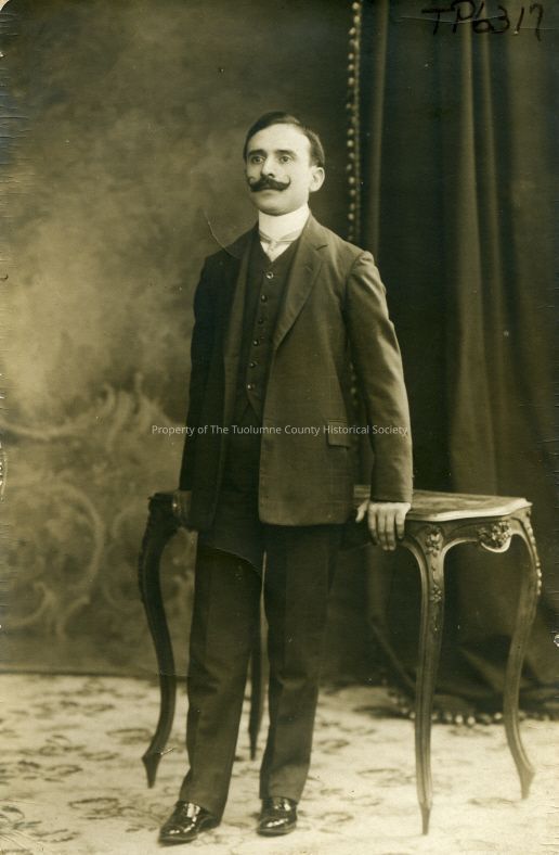 Portrait- Man not identified. Post card from the Luigi Passalacqua Family to Columba Bacigalupi from Buenos Ayres (sic). Man standing with hand resting behind him on table top.