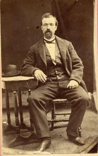 People, Photography, Unidentified Man, Studio Portrait, full length, Men's fashions, Men's Hats, Men's hair styles, Moustache & goatee, John E.D. Baldwin Photographic Gallery, Santa Cruz, Unidentified man, full length black and white portrait, subject is seated on chair next to small table, his right elbow resting on the table, next to a bowler type hat, he is wearing a three piece suit, medium lapels, vest appears to be shiny light materiel with lapel finish, boiled shirt front and with ribbon tie, hair is parted on the left and combed to th eight, moustache and goatee.