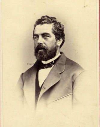 Unidentified man, portrait vignette. He is pictured wearing "grey" coat with rounded lapels, dark vest, dark bow tie on wing tip collar. The gentleman has curly hair parted on the left, combed to the right and well over his ears, he has a full beard and moustache. Bradley and Rulofson.
