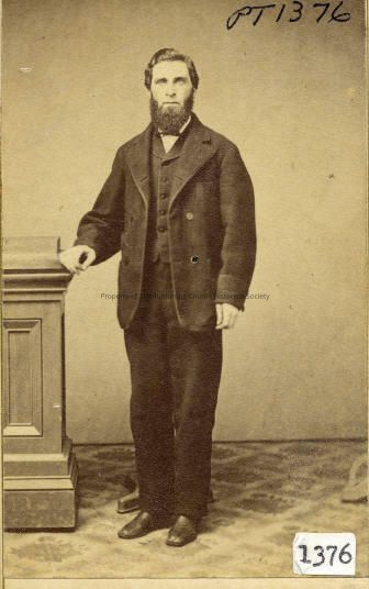 Unidentified man, full length portrait, subject is pictured standing next to wooden stand, right hand resting on the column. He is wearing dark three piece suit, coat is finger tip length, wide lapels, vest buttons up the front with turned back collar close to the throat, shirt collar not visible, small bow tie, his hair is parted on the left combed to the right, no moustache, but full jaw line beard, part of the photo stand behind his feet.
