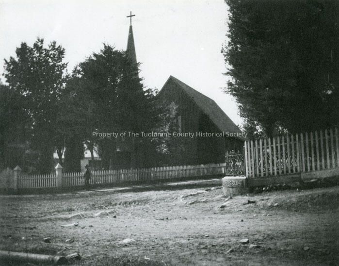 A black and white photo of the St. James Episcopal Church in Sonora