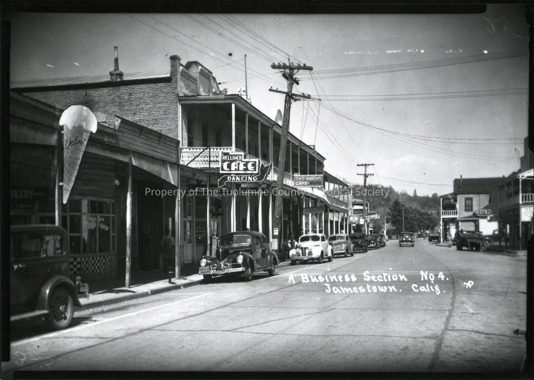 Main St., Jamestown, CA. Business section. The following along main street: Smoke Cafe, Rocca Hotel, Kelleher Cafe, Bakery, Jamestown Laundry, Bristol's Barber Shop, Royal Hotel right side of street. Circa 1940's.
