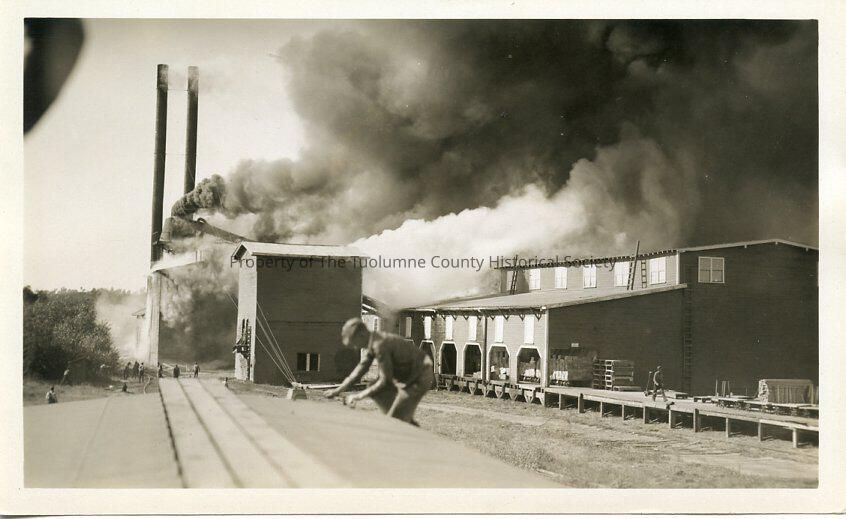 A 3.5" x 5.5" Black and white photo of the fire at Pickering Lumber Box Factory; building shown is the fuel house. The fire was in 1932.