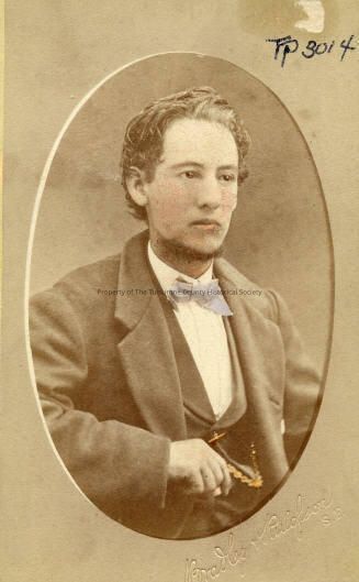 Unidentified man from the Fahey family. He is wearing a suit, vest, dress shirt and bow tie. A watch fob can be seen. The photo has been tinted.