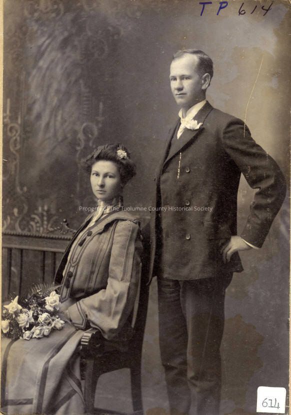 Unidentfied couple, Celebration of a wedding, Husband is standing, Wearing a dark dress suit, Wife sitting on a chair with a beautiful bouquet of flowers, Wearing a wedding dress, Flower in hair, Biography