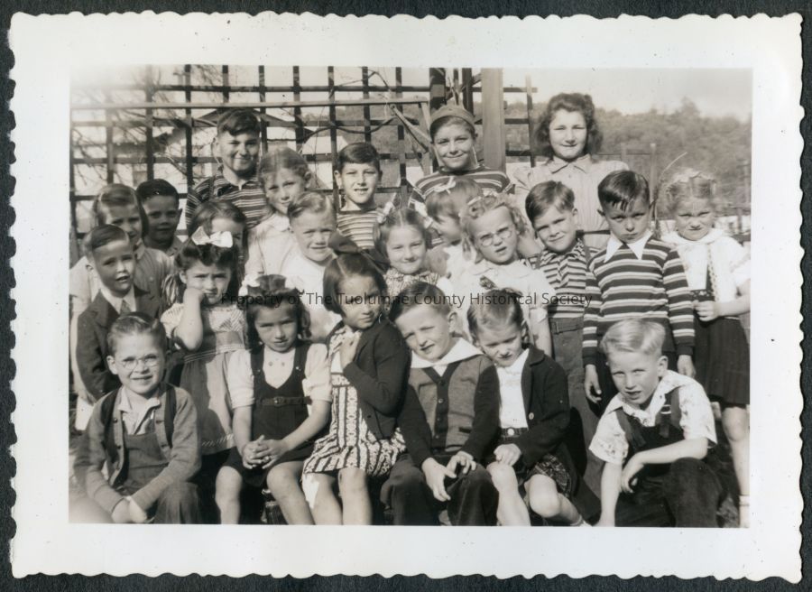 Black and white photo from Don Calvert album 2 of a group of 2 dozen kids and and older young lady. The kids are dressed in a range of clothes from cardigans, suits to plane pullover shirts. Some of the girls have bows in their hair, all are wearing dresses or skirts. They are standing in front of a trellis with winter branches and no leaves. There is a building behind them and a forested hill in the back ground.Collection