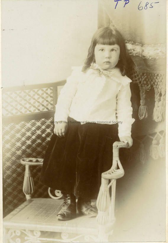 Unidentified young child, probably a boy, dressed in dark full trousers and white shirt standing on chair. He has long shoulder length hair with straight bangs.