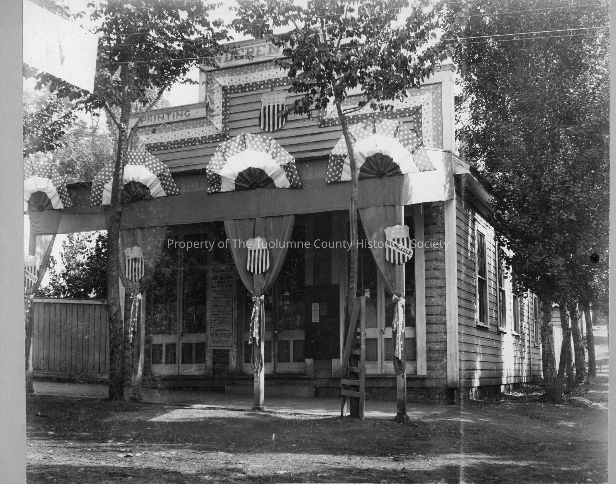 Independent Office, on north east corner of Jackson and Washington Streets, Sonora CA, where Memorial Hall is today. Decorated for Admissions Day, Sept 9, 1895. No other information on photo.Collection