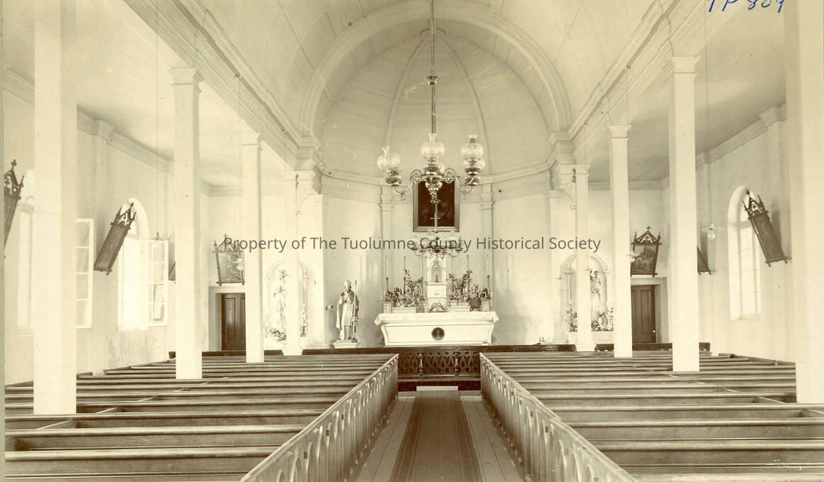 Building- Interior of St. Patrick's Catholic Church, Sonora, CA, showing the old altar from the front entrance. Type: Paper