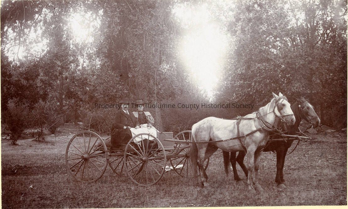 Photo of 2 unidentified people in buggy with a, team of horses, man and lady, horses drawn buggy, Vehicle-Animal Drawn