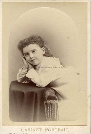 A black and white portrait of an unidentified young girl. Has long curly hair, wearing long sleeve white dress and leaning on a cloth covered round table. Photo in Album #1