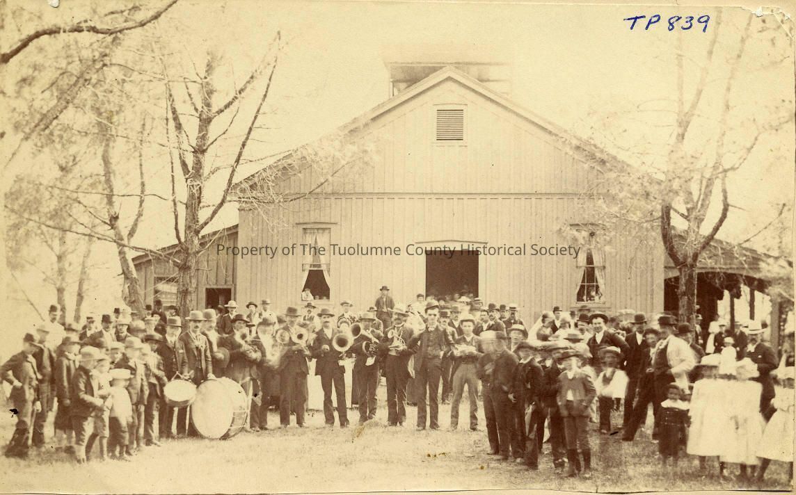 Group of people and band in front of a building. Could be a church group in front of the Mesdames Church in Murphys. Type: Paper