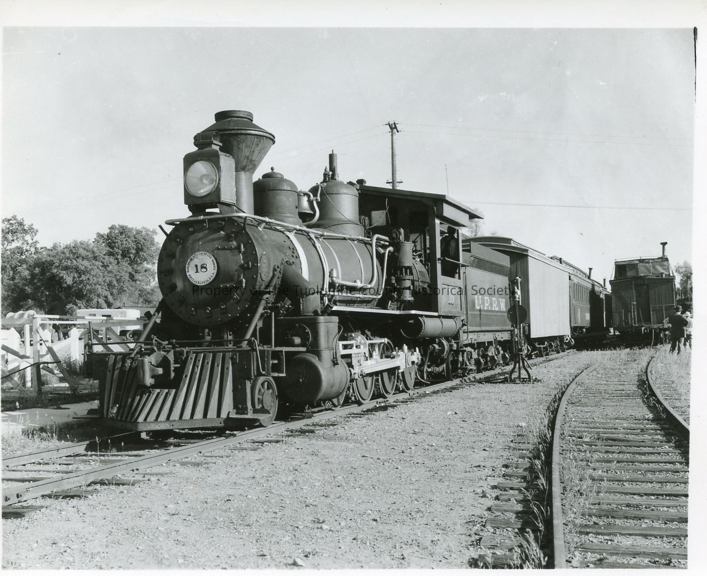 A black and white photo of the Sierra RR locomotive #18 in Jamestown. The engine appears to be lettered for the Union Pacific Railway (U.P.R.) most likely for a movie.