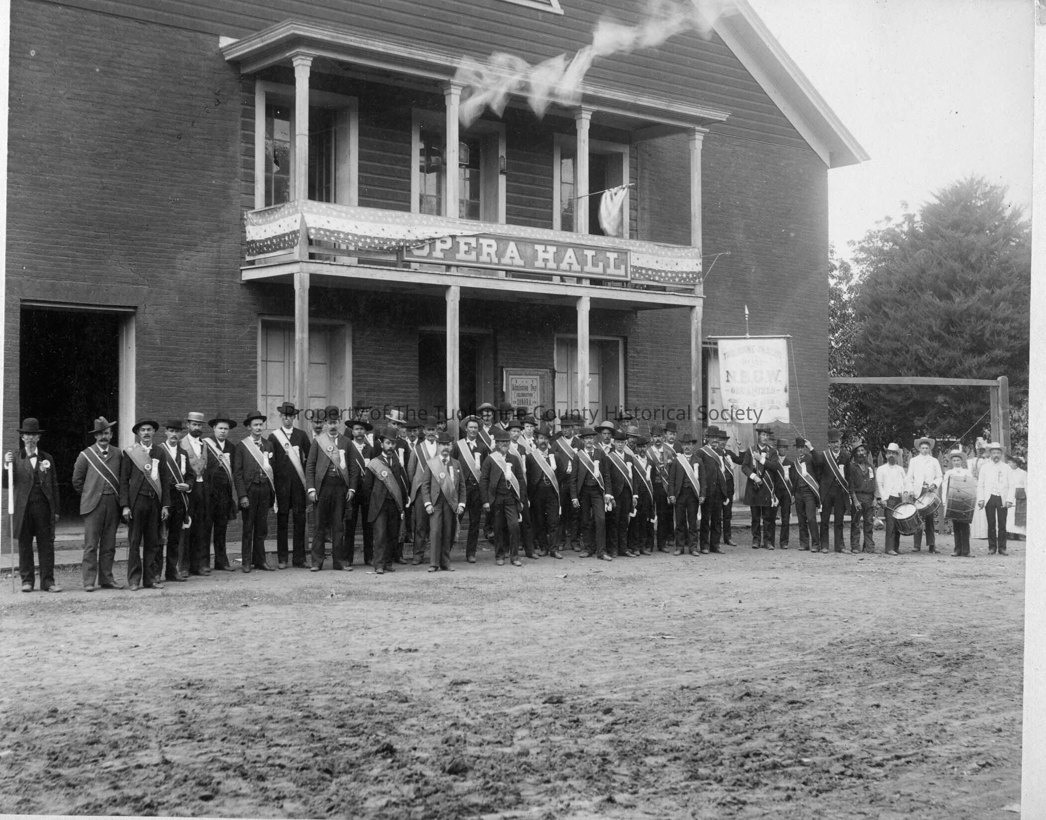 Sonora Opera Hall Sept 9, 1891, 37 NSGW men in front, most of whom are identified.. Shows front of building.