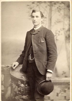 Portrait-Unidentified Man. A black and white portrait of an unidentified man. Wearing suit with vest.Vest has a watch chain and he is holding a hat. Photo from Album #2 Type: Paper