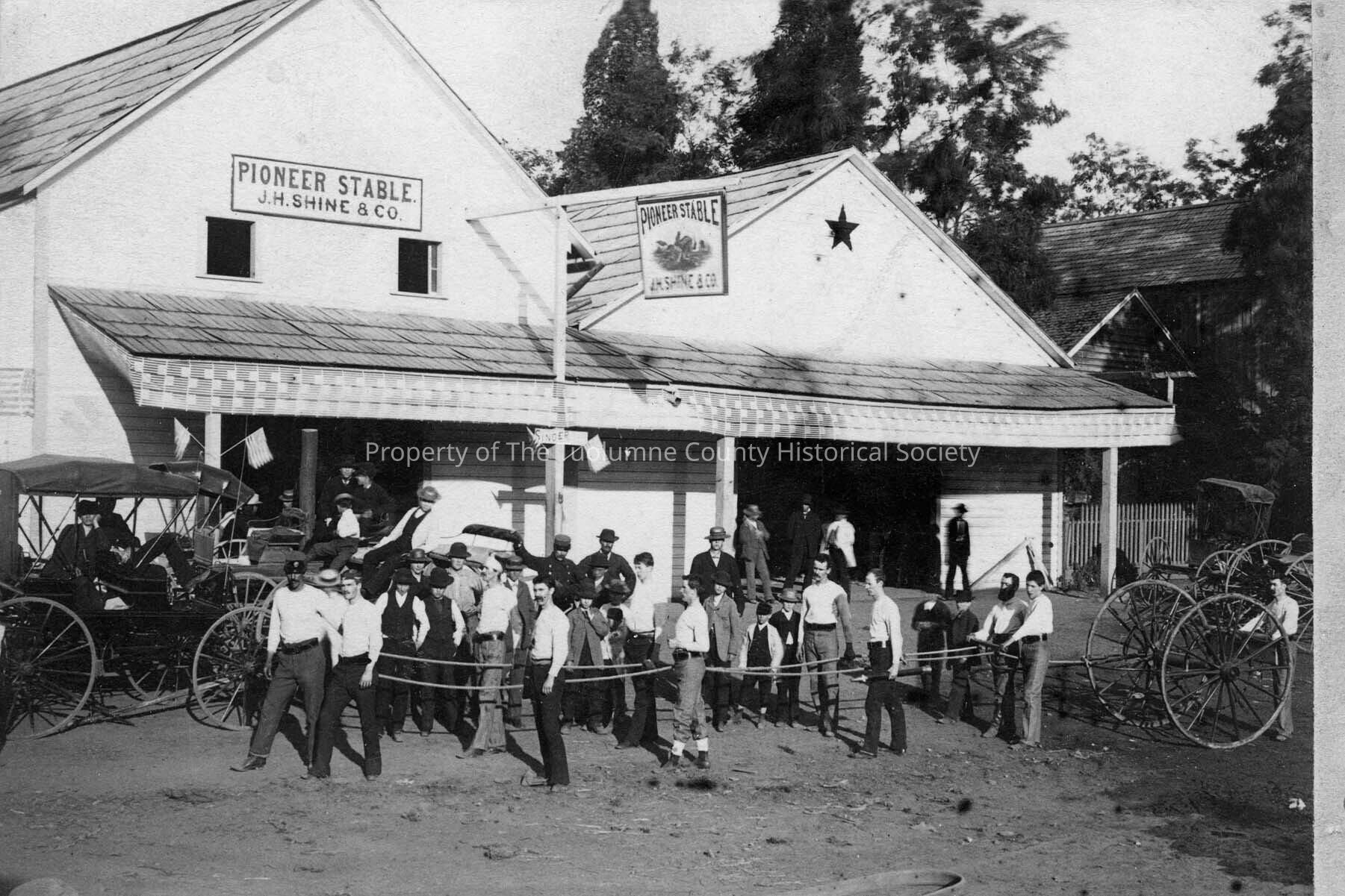 Pioneer Stable owned by J. H. Shine & Co. located on east side of South Washington Street, between Stockton and Church Streets. Looks like volunteer fire companies, circa 1900, nothing on backCollection