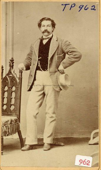 Portrait- Unidentified Man. With light colored pants, jacket has the outside edges outlined with fabric, vest is dark and has a watch fob hanging from the pockets, with a bow tie. He has a full mustache and curly hair. Standing leaning on a chair with one hand and holding a hat with the other.