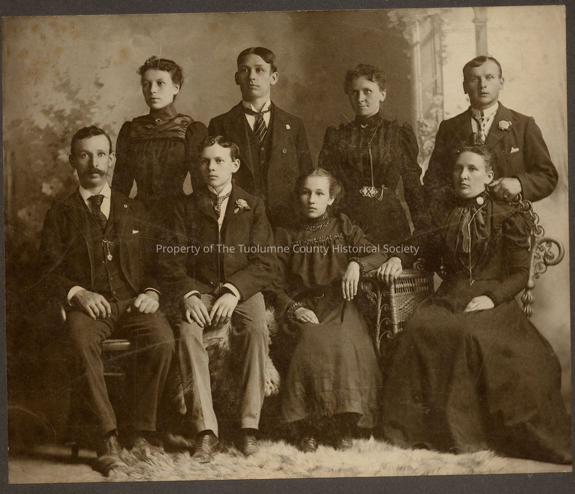 Formal family group picture. Part of Bacigalupi family? (8 people), Biography, unknown