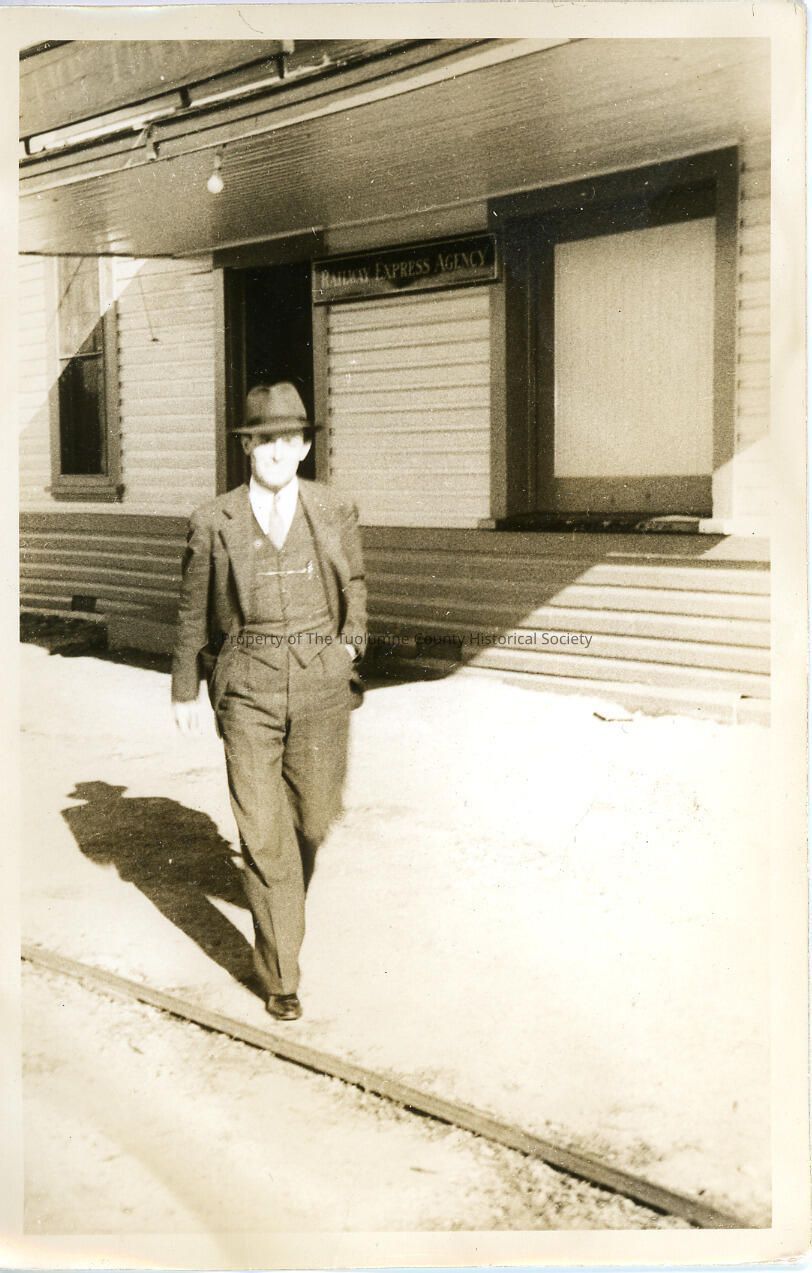 William Charles Cheney who was the general manager of the Sierra Railroad in Jamestown. He worked for the railroad in Sparks, Nevada before signing on at Sierra RR in 1922. Subject is at the Jamestown train depot with sign reading "Railway Express Depot".Collection