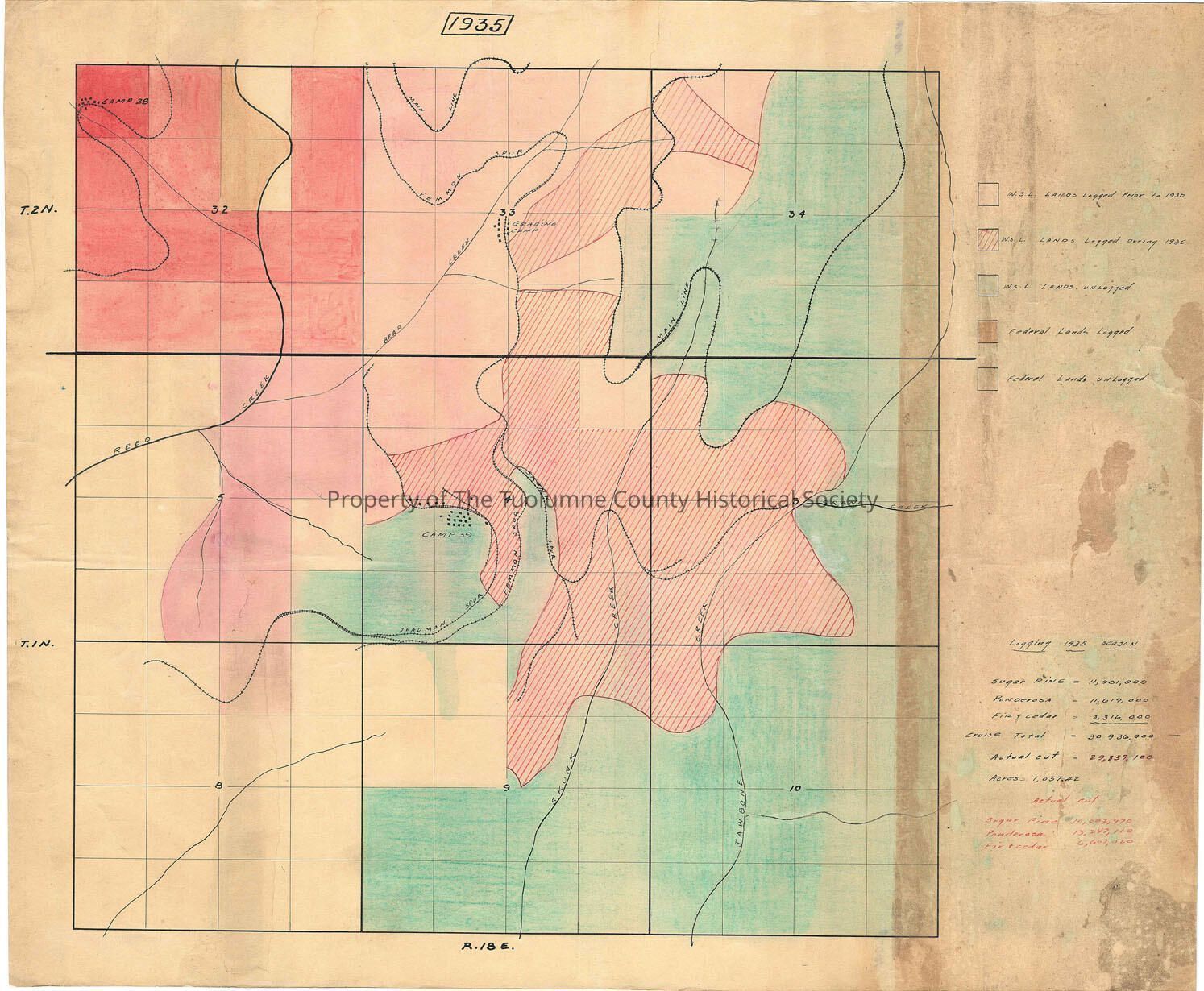 It also shows lands in the area owned by the US government (Stanislaus NF) some of which are logged and some are unlogged. It also shows quite a bit of West Side Lumber Co. lands which are unlogged.