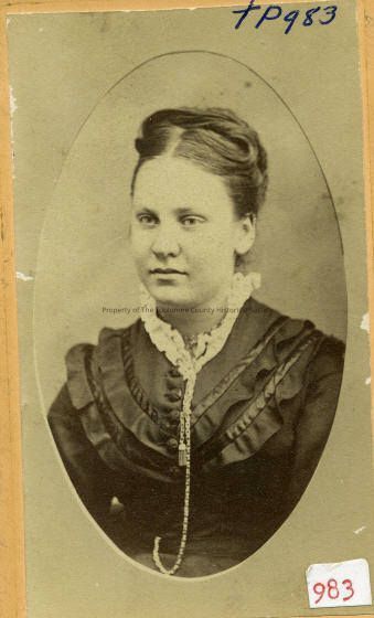 Unidentified woman - Pocket portrait vignette. Subject is wearing a ruffled dark dress with a white lace collar and watch fob with braided hair.