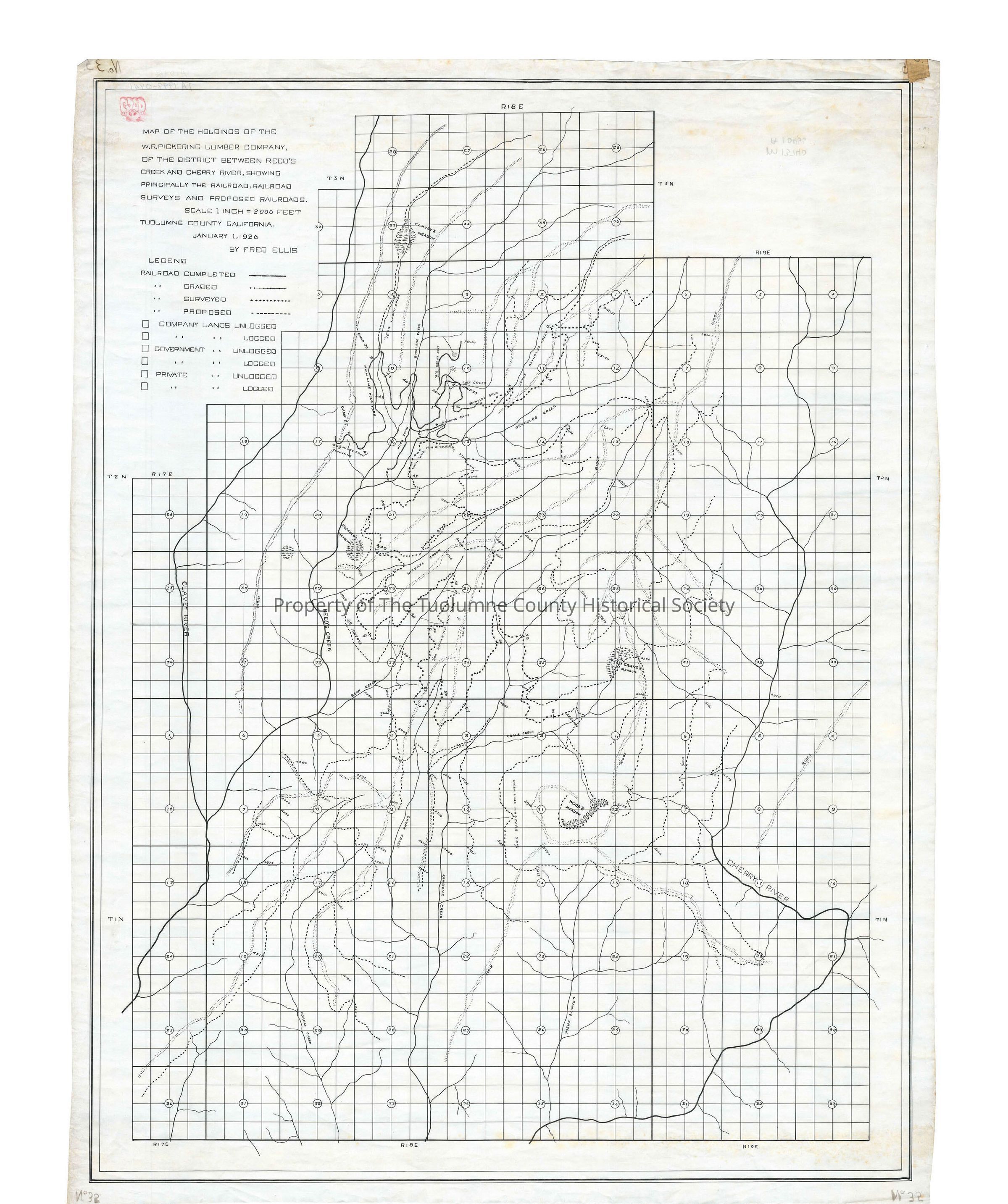 forestry map, logging, railroading, Hetch Hetchy & Yosemite Valleys Railroad, W R Pickering Lumber Company, Tuolumne, Clavey River, Reeds Creek, Crane Creek, Bourland Creek, Lost Creek, Little Reynolds Creek, Reynolds Creek, Niagara Creek, Bear Creek, Jawbone Creek, Skunk Creek, Granite Creek, Cherry River, Woods Meadow, Crane Meadow, W R Pickering lands Reeds Creek to Cherry River