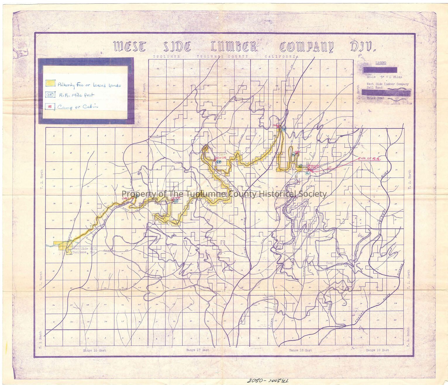 forest map, logging map, railroad map, West Side Lumber Company Railroad, Lilly Creek, Trout Creek, No Fk Tuolumne River, Basin Creek, Two Mile Creek, 76 Creek, Bourland Creek, \Cottonwood Creek, Niagara Creek, Bear Creek Clavey River, Reed Creek, Lost Creek, Reynolds Creek, Cherry River, Duckwall Creek, Hunter Creek, Corral Creek, Skunk Creek, Jawbone Creek, River Bridge Cabin, Camp * Cabin, Camp 24 Cabin, MP 38 cabin, Bourland trestle Cabin, Reynolds Creek Cabin, End of track at Reynolds Creek.